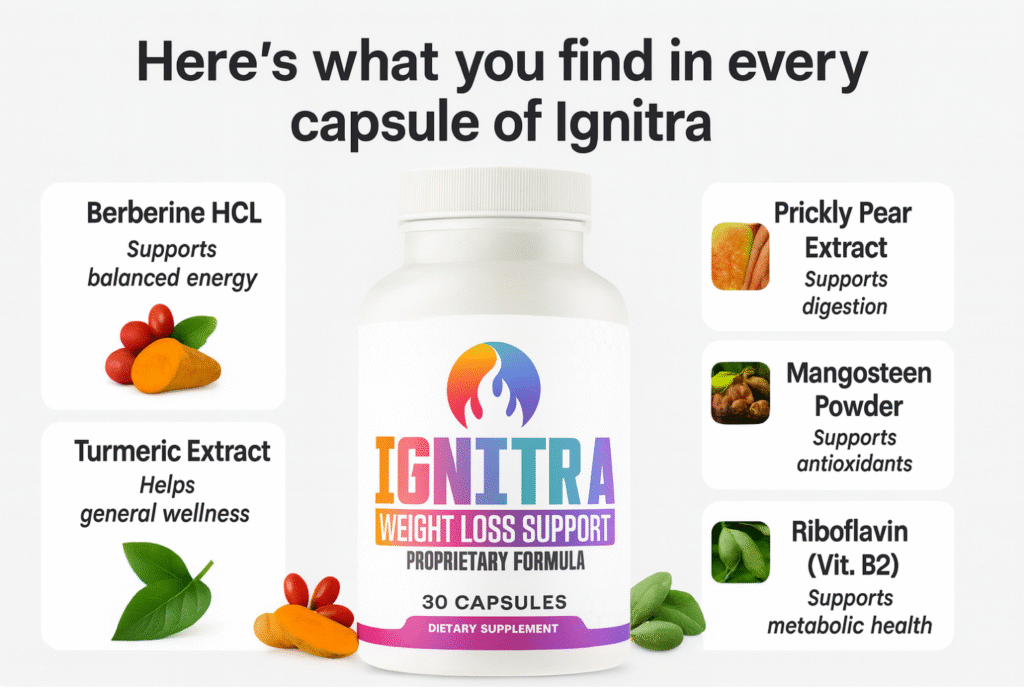 Ignitra is made with 100% natural, plant-based ingredients, including Berberine HCL, Turmeric Extract, Prickly Pear, Mangosteen Powder, Konjac Extract, and Riboflavin (Vitamin B2) — all blended in a balanced formula designed to support overall metabolic wellness.